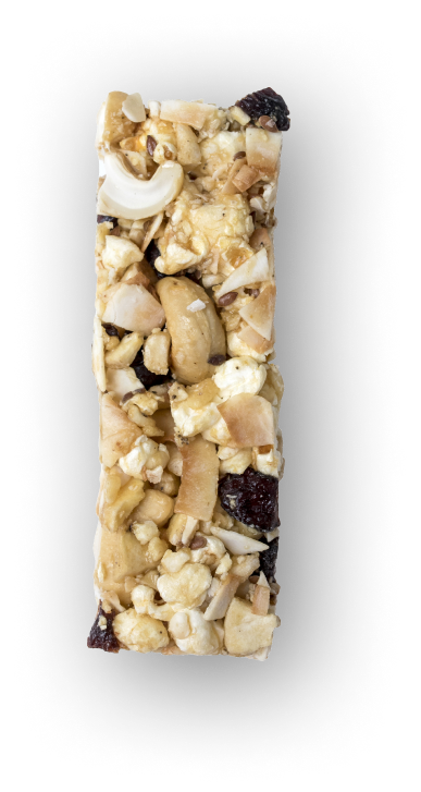 banan suszony, miód, orzechy nerkowca, płatki kokosa, żurawina suszona, syrop ryżowy, popcorn, siemię lniane, sól.