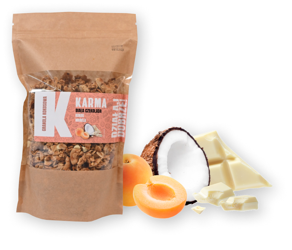 Płatki owsiane, miód, biała czekolada, syrop ryżowy, kokos w płatkach, olej rzepakowy, orzeszki ziemne, morele suszone, mąka kokosowa, migdały, siemię lniane, płatki jaglane, skórka z cytryny, sól morska, imbir, cynamon, kardamon