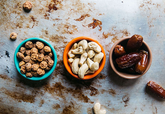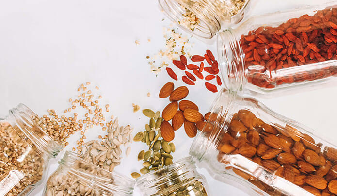 migdały, miód, orzechy pekan, orzechy laskowe, syrop klonowy, syrop ryżowy, proso ekspandowane, siemię lniane, sól morska