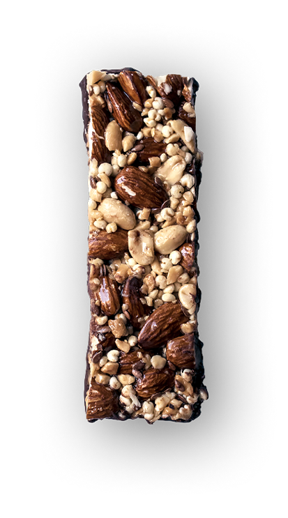 migdały, orzechy ziemne, gorzka czekolada, pasta z orzechów ziemnych, miód, syrop ryżowy, proso ekspandowane, siemię lniane, sól morska